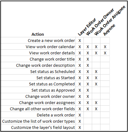 The table below lists all the different actions a user might want to perform on their work orders. And the four columns on the right show the various roles that are allowed to perform each action. "Layer Editor" refers to any person with edit permission for the work order layer. "Work Order Owner" refers to the person who was marked as the owner of a specific work order, "Work Order Assignee" refers to the person(s) who a work order was assigned to. And "Anyone" refers to all users listed on your account.